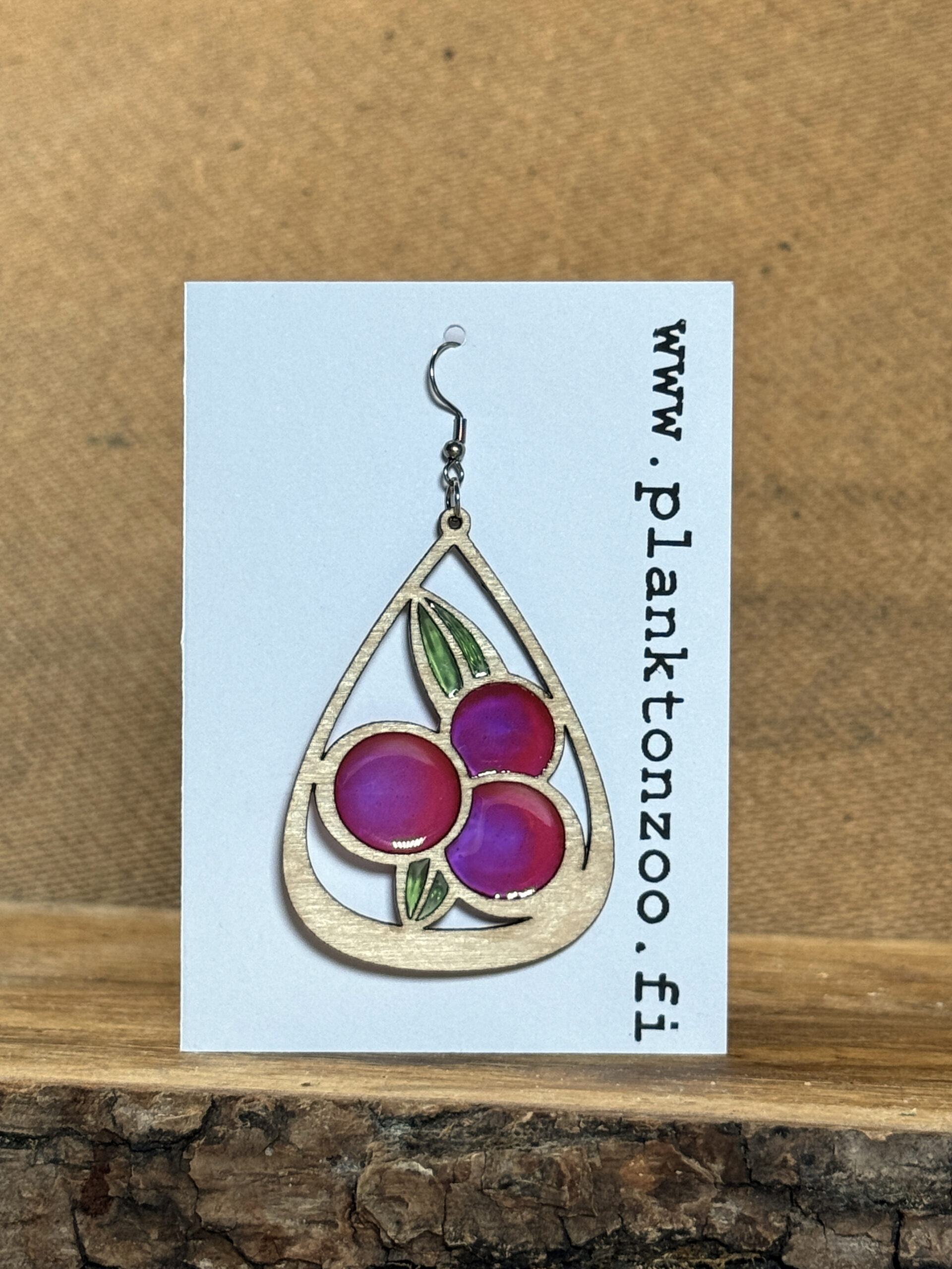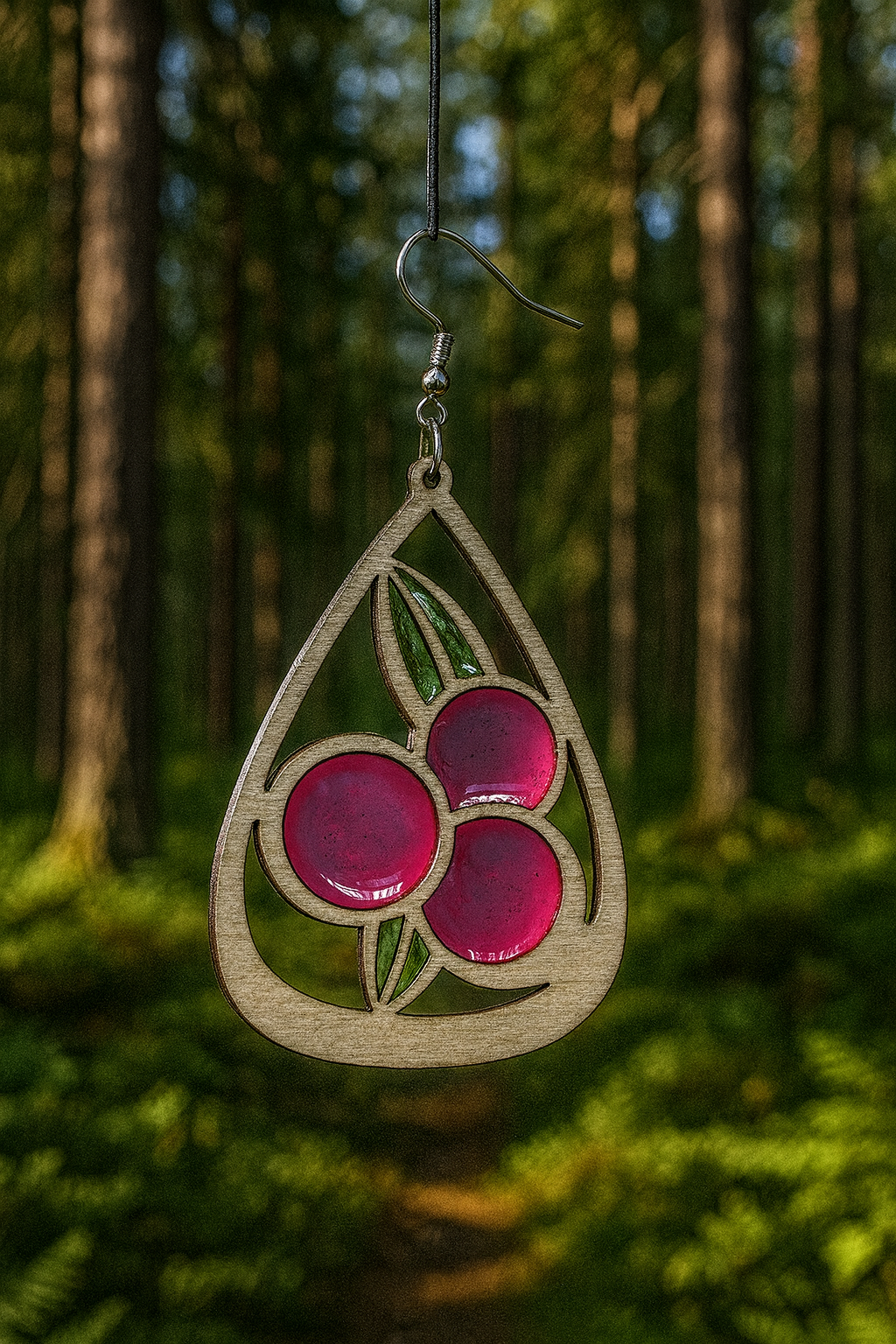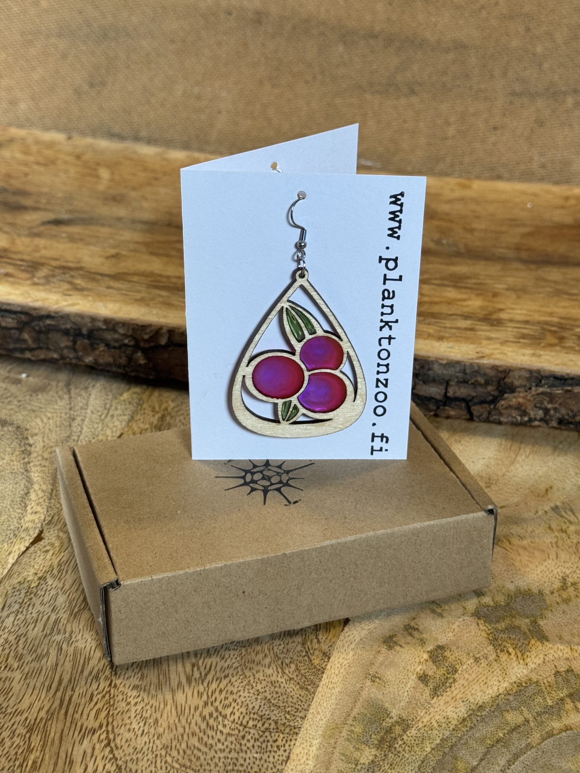 Lingonberry design earring inspired by Finnish nature. Handmade with lightweight Finnish birch plywood, a resin interior, and stainless steel hooks. Package includes 2 earrings. Height: 64mm, Width: 45mm, Thickness: 2mm. Design and craft: Claire Hedström